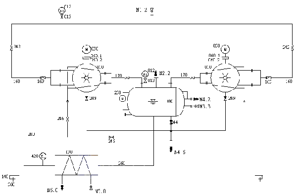 工作液用于形成真空泵的液環(huán)。工作液通過管線(260),自分離器(080)流入換熱器 (130),冷卻后通過管線(280)返回真空泵。在此過程中,壓縮產(chǎn)生的熱及隨被抽氣體 帶入的熱被釋放掉。該閉環(huán)機(jī)組設(shè)計為兩臺真空泵(010)共用一臺分離器(080)和一臺換熱器(130)(真空泵一開一備),一臺真空泵工作時,備用泵的吸氣管路和排氣管路上的蝶閥須關(guān)好。正常多采用一臺真空泵(010)配套一臺分離器(080)和一臺換熱器(130)。